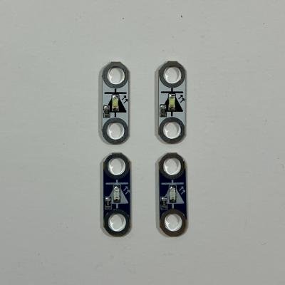 Each board has an LED and an 820-Ohm resistor in series to protect the LED from over-currents. The color of the board reflects the color of the LED for quick identification. An LED symbol is printed on the front and back to identify the orientation of the LED. You will get two blue LEDs and two white LEDs.