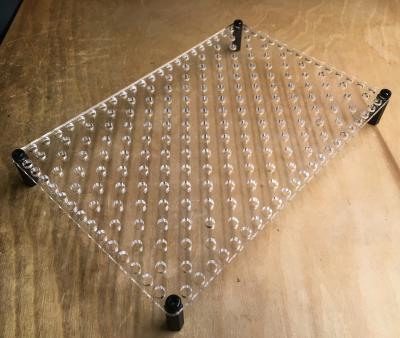 The board has 230 holes to accept our spring contacts and it can be mechanically linked to Lego bricks and Lego technic components. In the Lego raster, it is 16 x 24 large. Its shorter side is exactly half the length of a Lego baseplate which is 32 x 32.