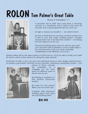 A roll-on table adds to the attractiveness of your tricks and adds considerably to the efficiency and professional appearance of your act. So easy to build that the author claims you can have excellent results, even if this is your first magic building project. Detailed measurements and a complete listing of all materials is included. Everything has been figured out for you. These illustrated building plans take you step by step through the process, until your beautiful table is finished.
